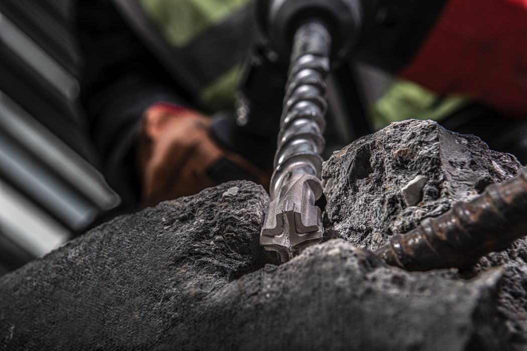 Duże ostrze z węglika z opatentowanymi skosami krawędzi. Zapewnia niższe wibracje i zoptymalizowaną wydajność wiercenia przy napotkaniu stali zbrojeniowej, co oznacza dłuższą żywotność.