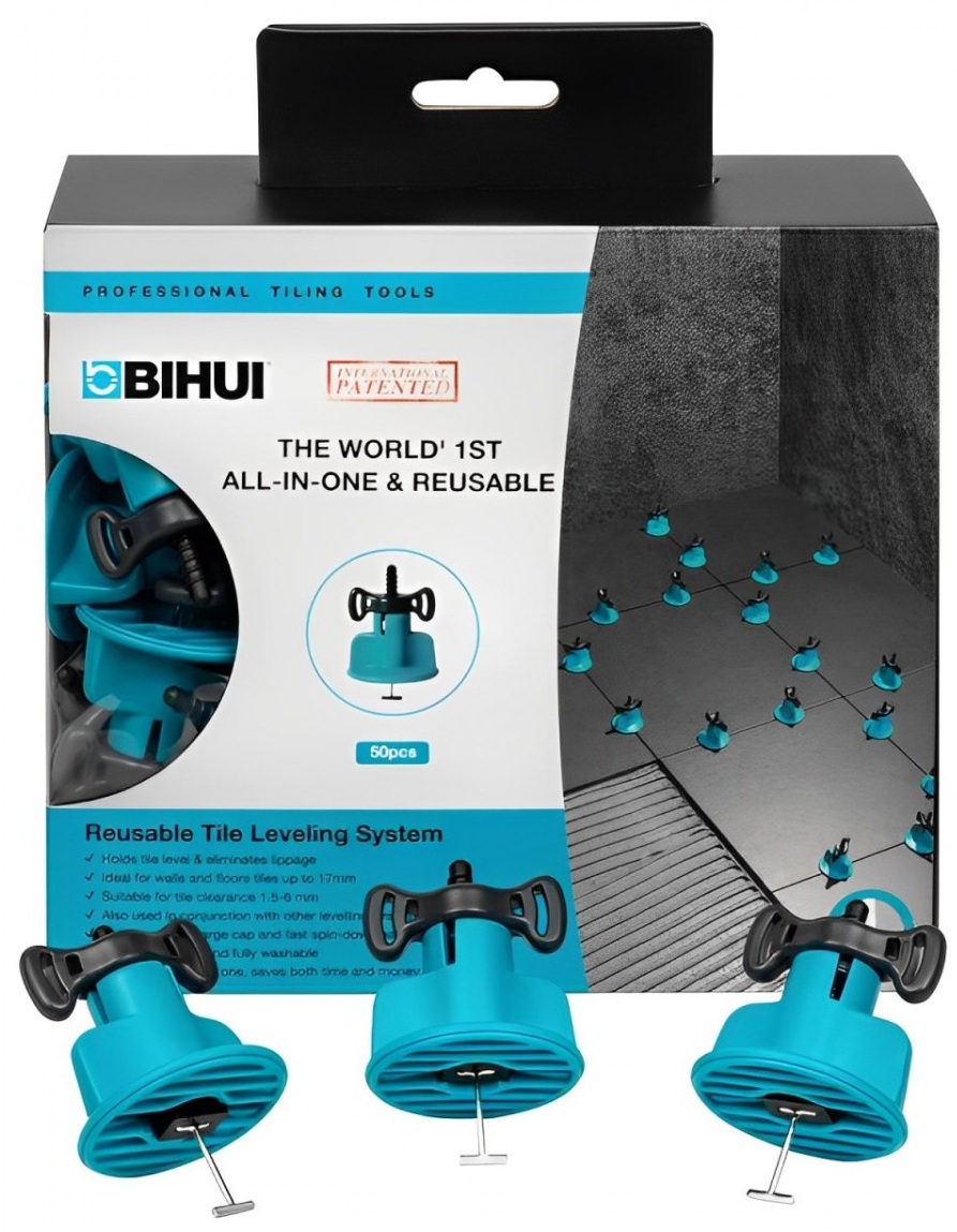 System poziomowania płytek BIHUI (TLS) oferuje możliwość wielokrotnego użytku i szybką instalację bez użycia dodatkowych narzędzi. Ten innowacyjny system zapewnia, że nakładka pozostaje nieruchoma po zamocowaniu do płytki , zapobiegając uszkodzeniom i zarysowaniom. Jest to jedyny system na rynku, który gwarantuje równomierne rozłożenie nacisku między nakładką a płytką ceramiczną. Dzięki temu system BIHUI TLS eliminuje zadziory i nierówności w poziomie układanych płytek. Nadaje się do fug o szerokości od 1,5 mm do 6 mm i grubości płytek od 2 mm do 17 mm.