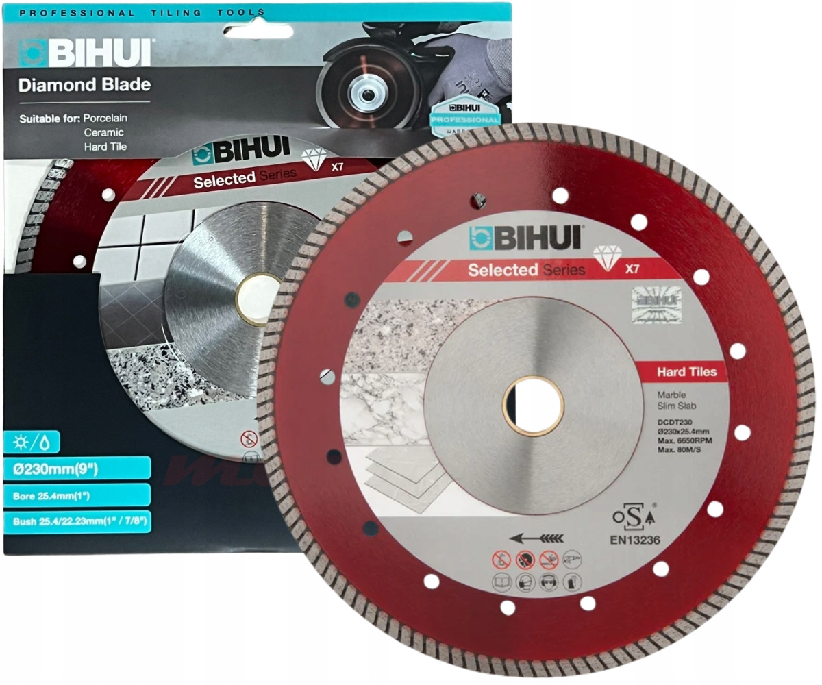 Tarcza diamentowa BIHUI B‑TURBO o średnicy 230 mm, przeznaczona do szybkiego i czystego cięcia gresu, porcelany i płytek ceramicznych. Charakteryzuje się obręczą 2 mm, segmentem 7 mm oraz możliwością pracy na sucho i mokro.