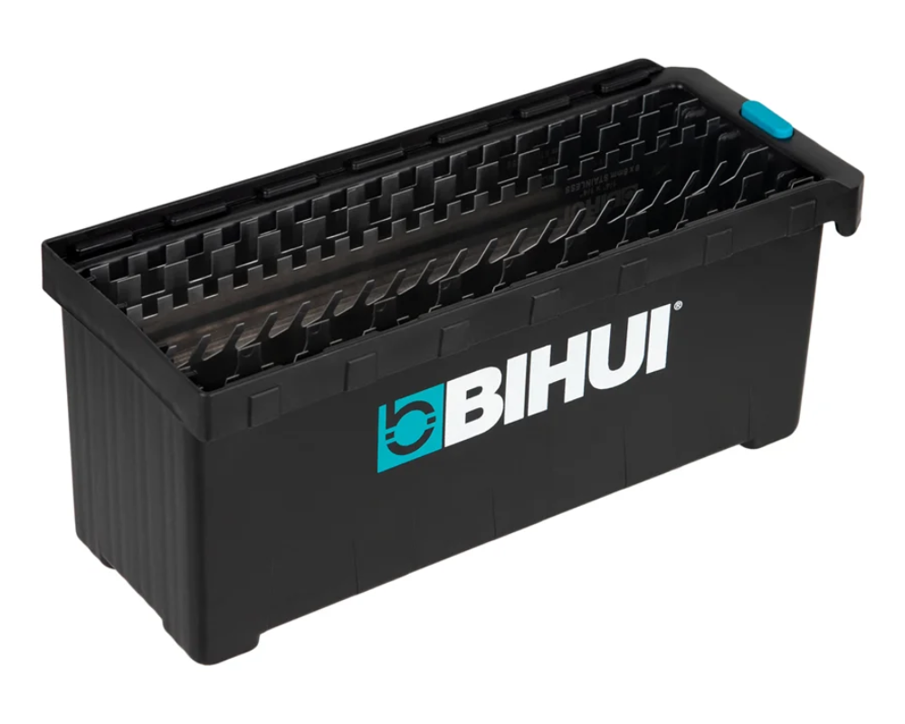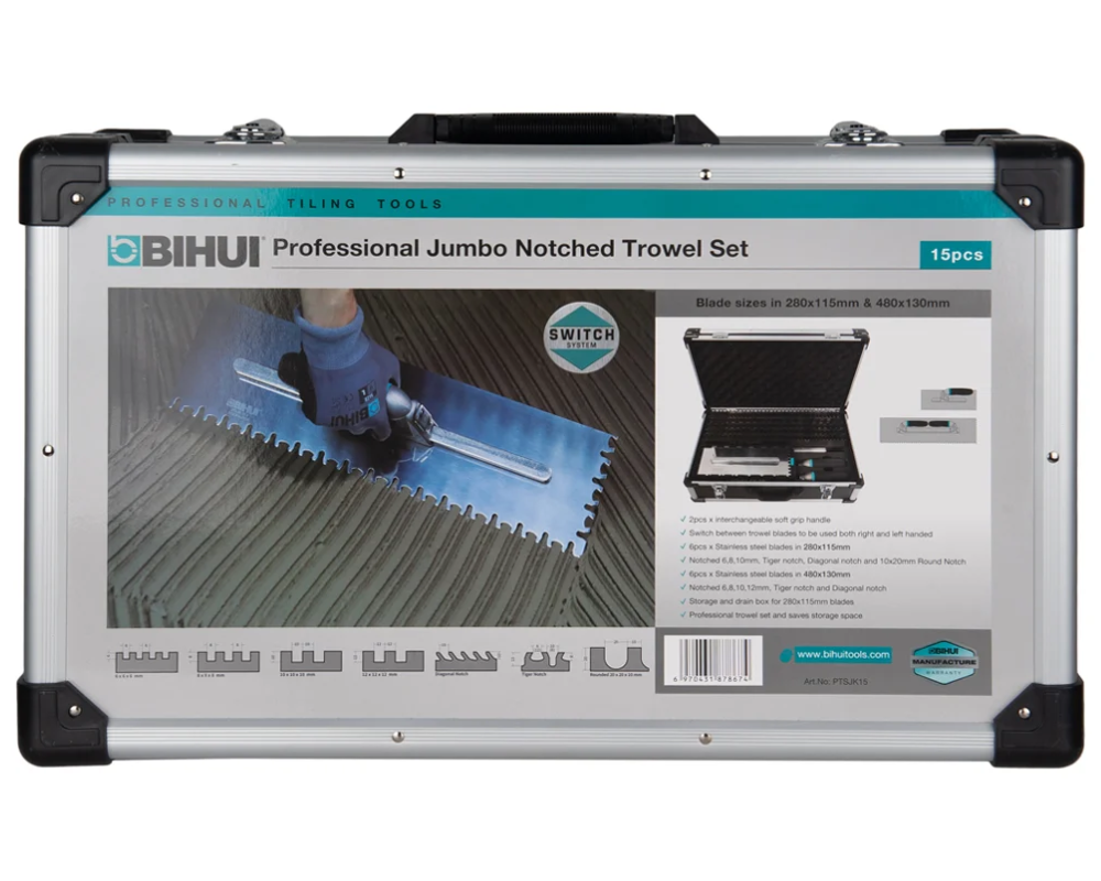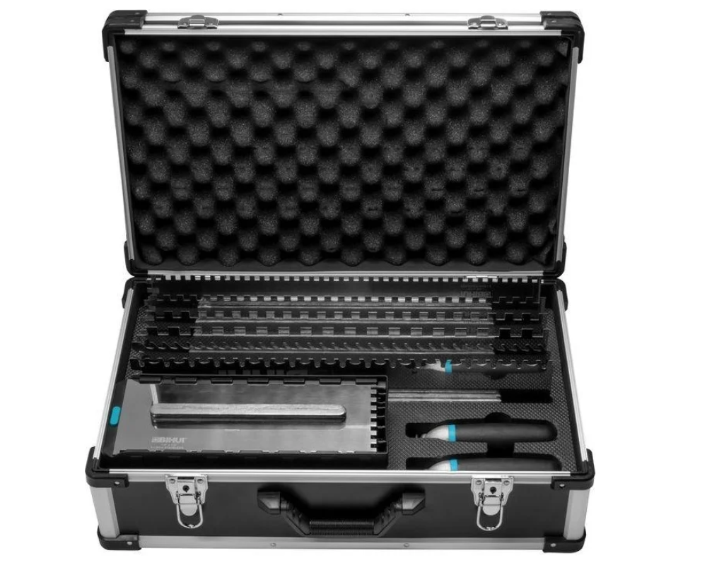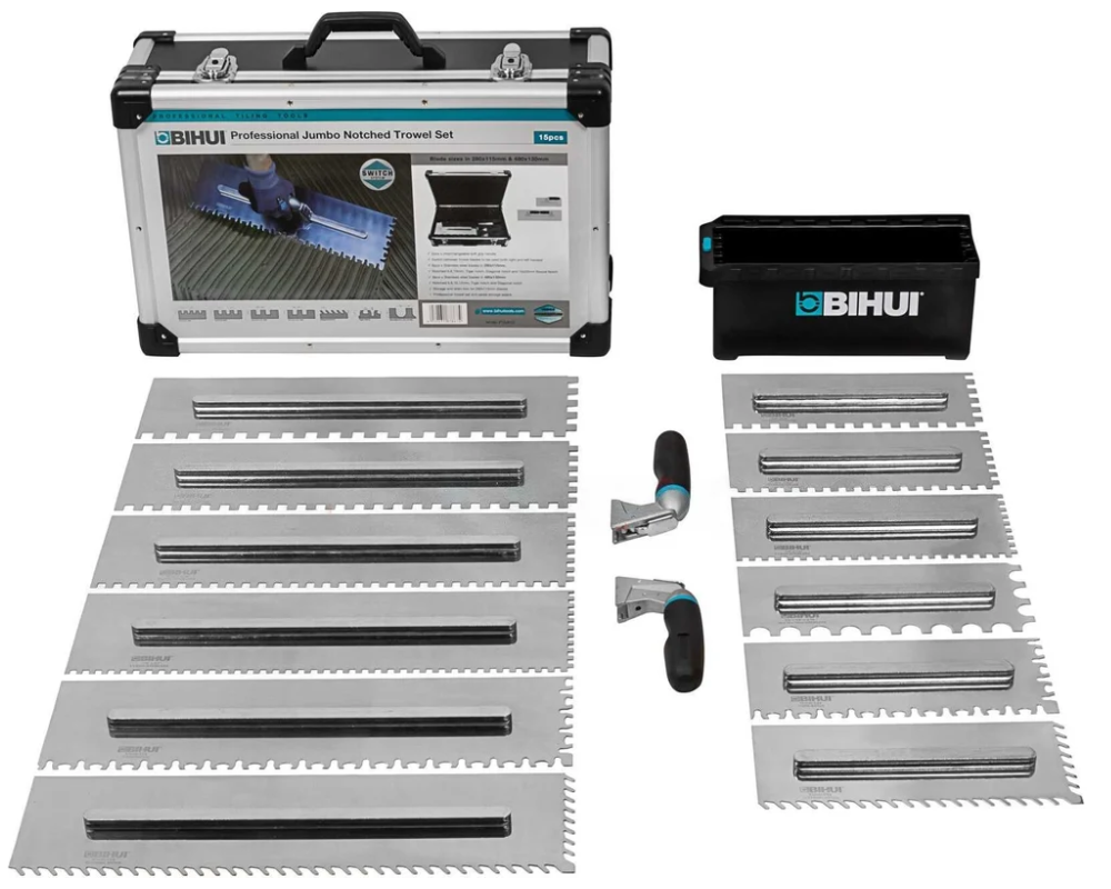 Zestaw ząbkowanych szpatułek ze stali nierdzewnej BIHUI (zestaw grzebieniowy) jest dostarczany w komplecie z sześcioma ostrzami o wymiarach 280 * 115 * 0,7 mm, sześcioma ostrzami o wymiarach 480 * 130 * 0,7 mm, dwoma wymiennymi uchwytami BIHUI FLEX, futerałem na 6 ostrzy 280 * 115 oraz etui do przechowywania całego zestawu.