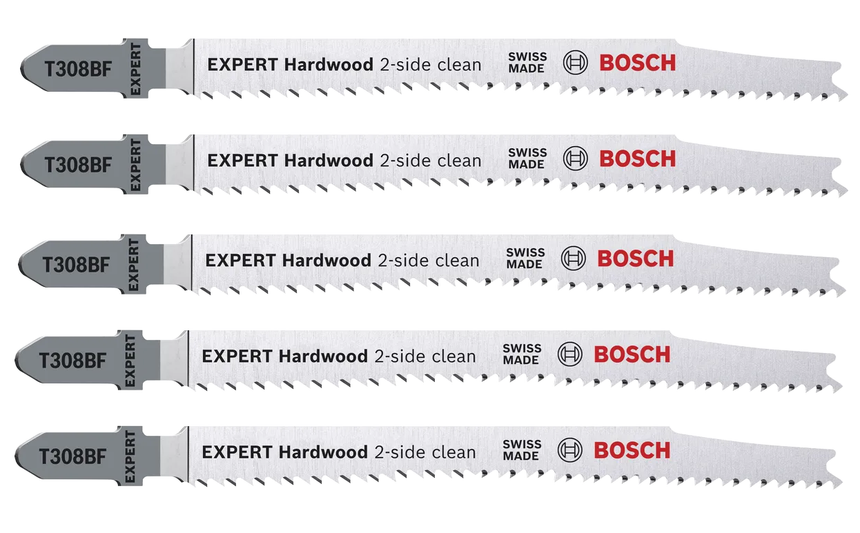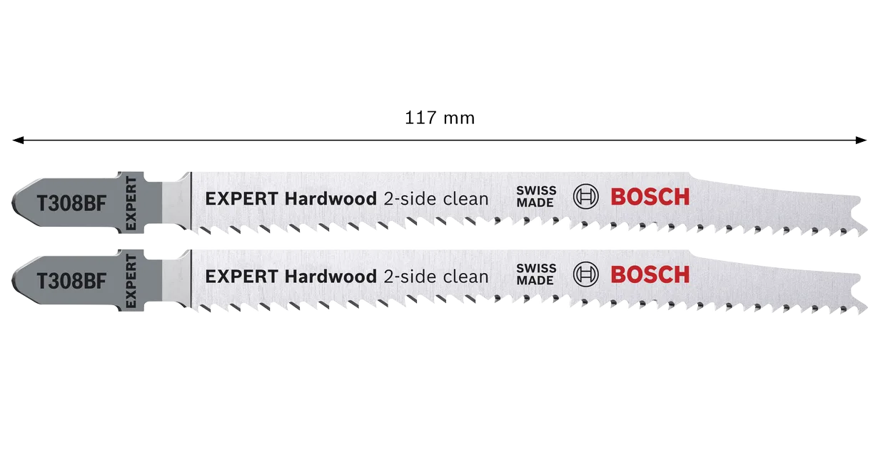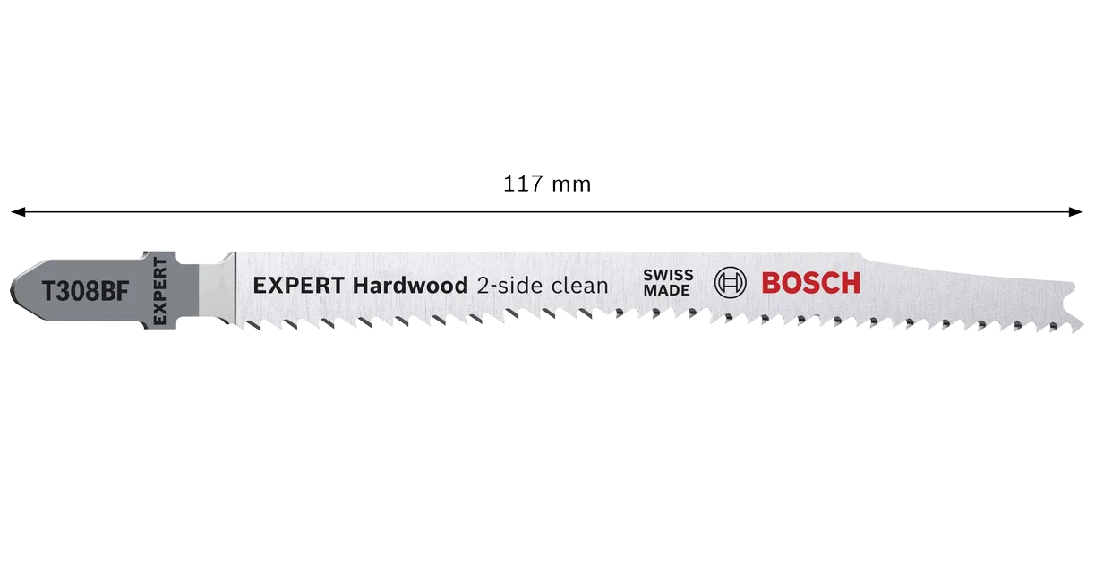 Wykonany z bimetalu — paska stali szybkotnącej połączonej z elastycznym brzeszczotem stalowym w celu połączenia wytrzymałości i elastyczności — brzeszczot do wyrzynarki Bosch EXPERT ‘Hardwood 2-side clean’ jest wystarczająco wytrzymały, aby ciąć blaty kuchenne z laminowanych płyt wiórowych lub twardego drewna.