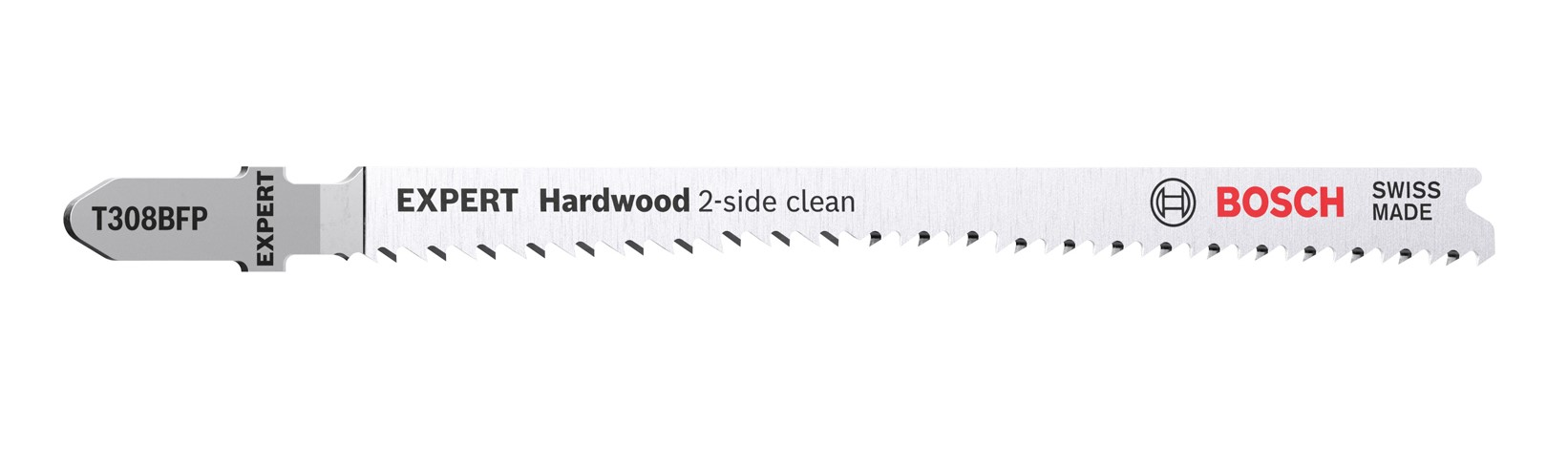 Wykonany z bimetalu — paska stali szybkotnącej połączonej z elastycznym brzeszczotem stalowym w celu połączenia wytrzymałości i elastyczności — brzeszczot do wyrzynarki Bosch EXPERT ‘Hardwood 2-side clean’ jest wystarczająco wytrzymały, aby ciąć blaty kuchenne z laminowanych płyt wiórowych lub twardego drewna.