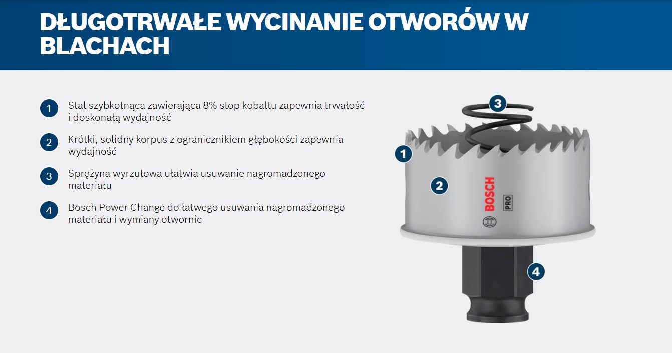 Piła otwornica PRO Sheet Metal do świetny, fachowy osprzęt do cięcia metalu. Jej zęby są wykonane z hartowanej stali szybkotnącej (HSS) z dodatkiem 8% kobaltu, dzięki czemu są ostre i trwałe. Ma odporną na zużycie obudowę i praktyczną sprężynę wyrzutową, która ułatwia usuwanie rdzenia.
