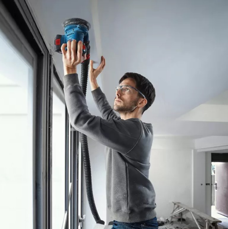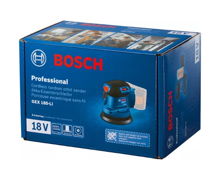 Model GEX 185-LI Bosch Professional wyróżnia się doskonałą konstrukcją, która zapewnia dobre wyważenie, stabilne szlifowanie i mniejsze obciążenie rąk. Wysoce wydajny silnik bezszczotkowy zapewnia czas pracy do 40 minut, a stałe tempo szlifowania dorównuje wersji sieciowej szlifierki. Narzędzie jest kompatybilne ze wszystkimi akumulatorami Bosch 18 V. Kompaktowa i lekka – ergonomiczna konstrukcja i niski poziom drgań umożliwiają łatwą i komfortową pracę przy użyciu jednej ręki.