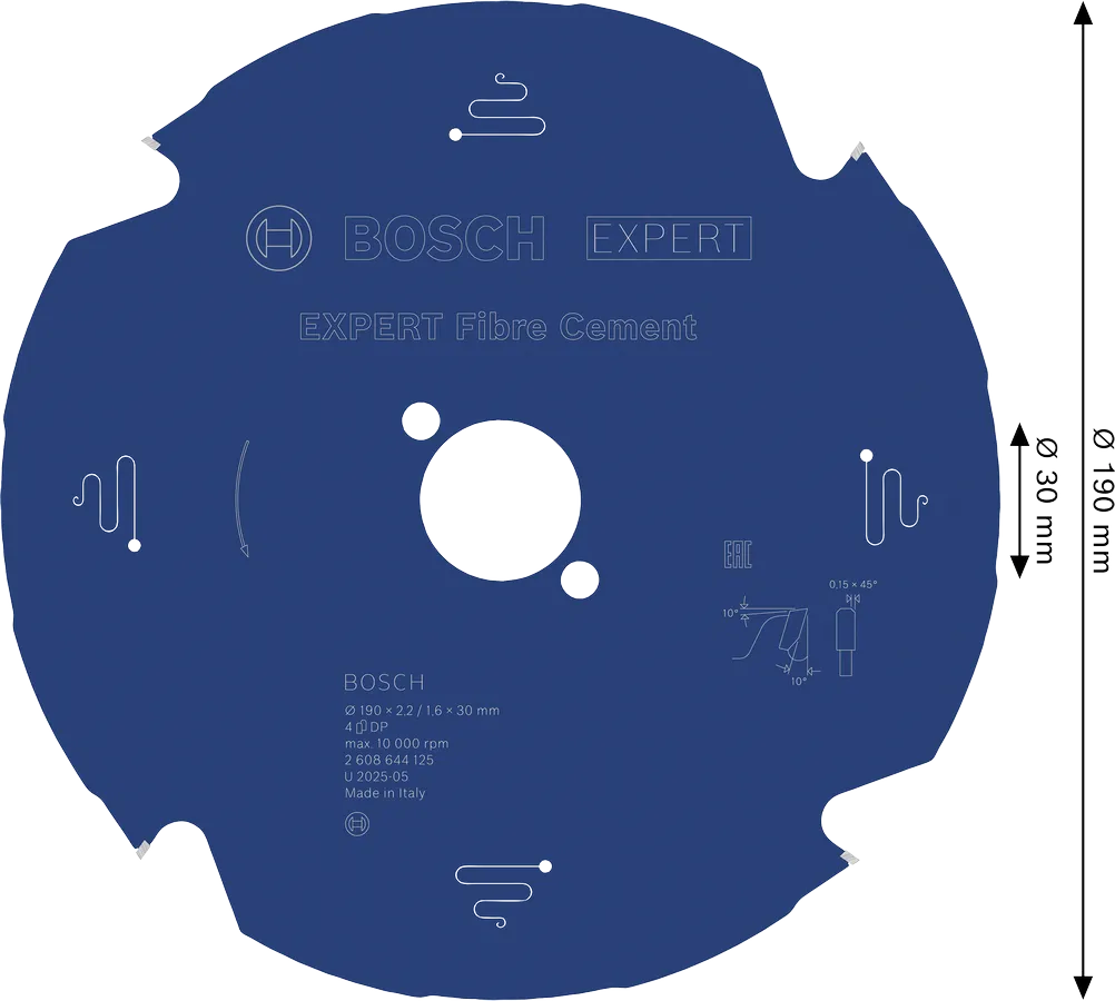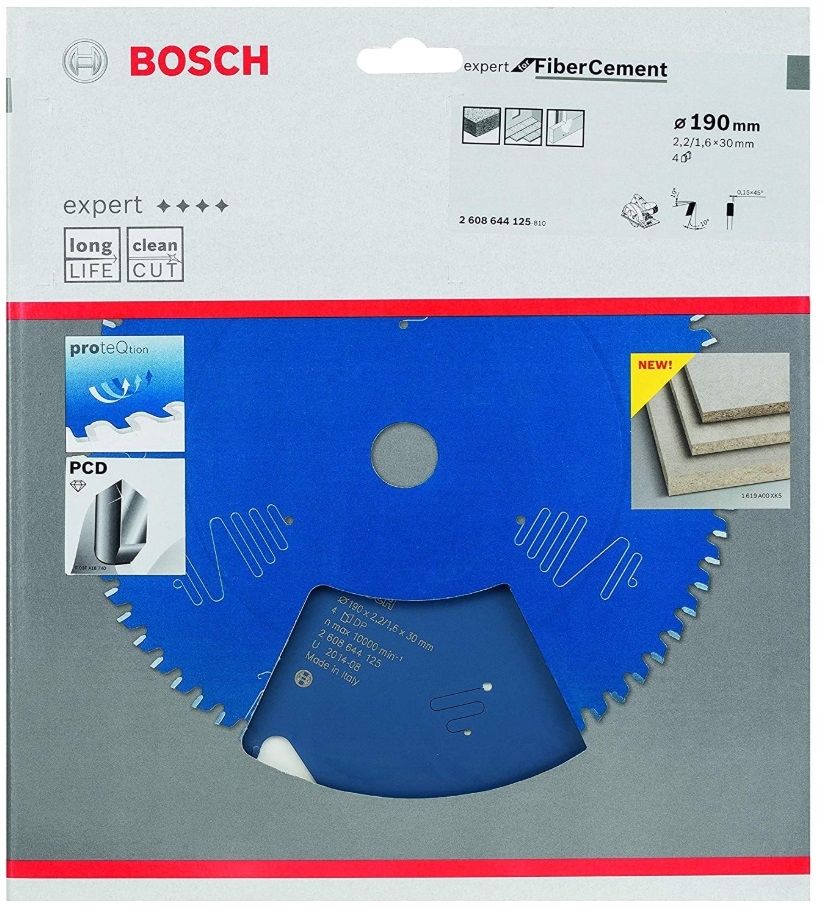 Tarcza pilarska Expert for Fibre Cement odznacza się wysoką trwałością w cięciu cementu włóknistego. Wyposażone jest w zęby PCD (z diamentu polikrystalicznego) zapewniające bardzo dużą trwałość. Dodatkową wydajność zapewnia specjalna powłoka Proteqtion zabezpieczająca przed korozją i zapewniająca niezawodne cięcie oraz zmniejszone tarcie. Dodatkowo, tarczę pilarską wyposażono w specjalne szczeliny antywibracyjne, które zapewniają wyjątkową płynność cięcia, ograniczają hałas i znacznie zmniejszają wibracje.