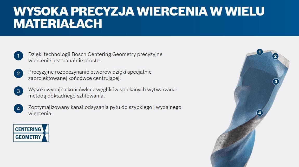 - Dzięki technologii Bosch Centering Geometry precyzyjne wiercenie jest banalnie proste.