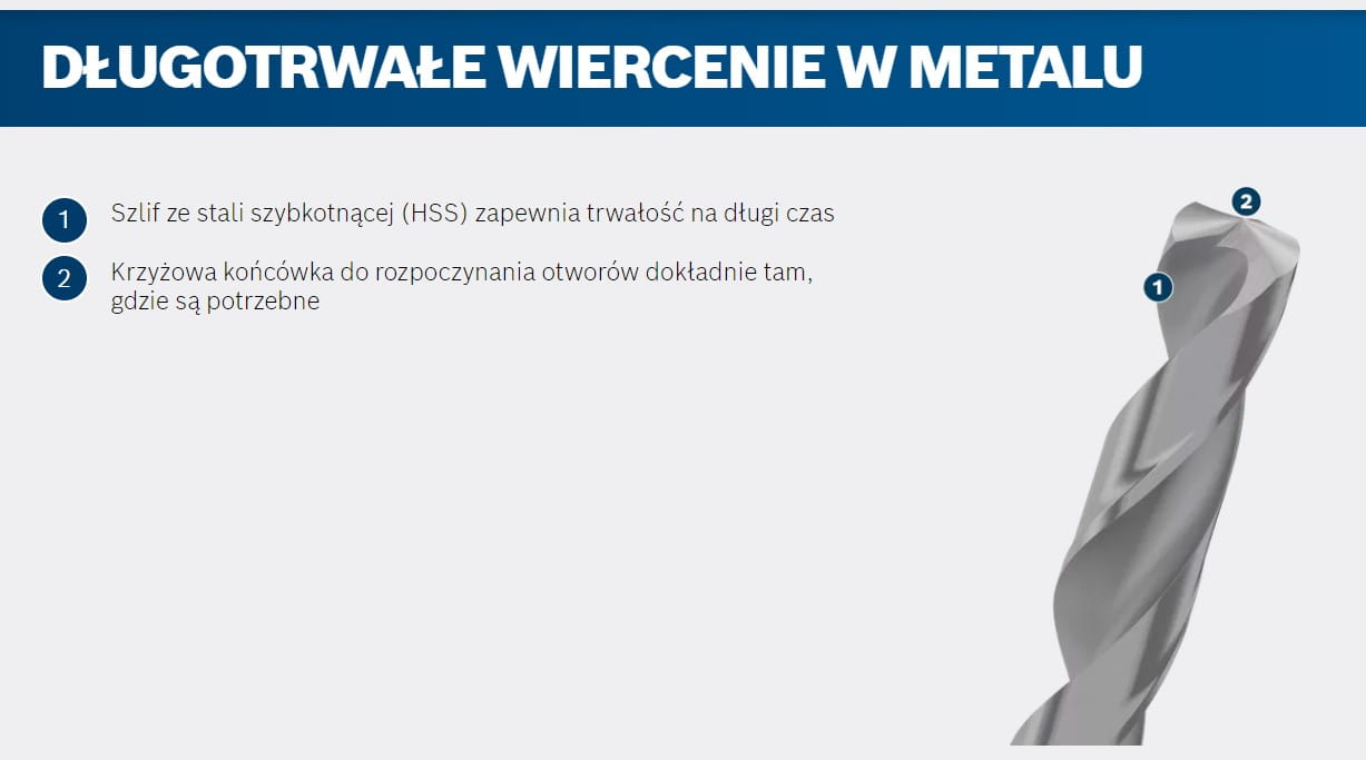 - Wysokowydajne, precyzyjnie szlifowane wiertło HSS