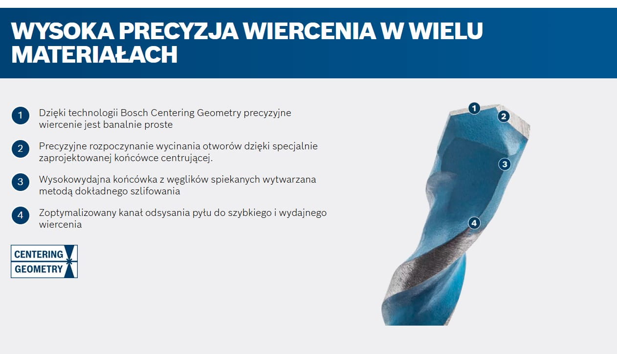 - Dzięki technologii Bosch Centering Geometry precyzyjne wiercenie jest banalnie proste