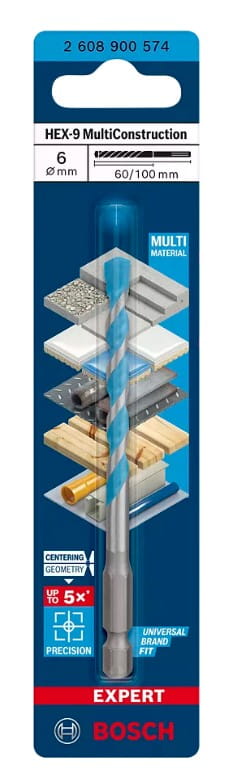 Wiertło Bosch EXPERT HEX-9 Multi Construction to jedyne wiertło, które zawsze powinno znajdować się w Twojej skrzynce narzędziowej: nigdy nie utkniesz w pracy ani nie będziesz tracić czasu na szukanie odpowiedniego wiertła.