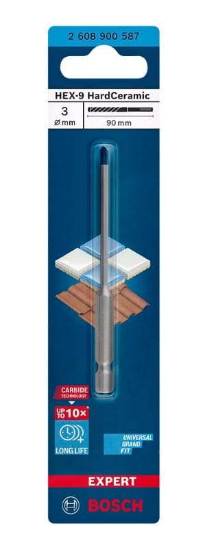 Wiertło Bosch EXPERT HEX-9 Hard Ceramic jest przeznaczone do wiercenia w ceramice i może wiercić otwory w twardych płytkach bez nawilżania i chłodzenia.