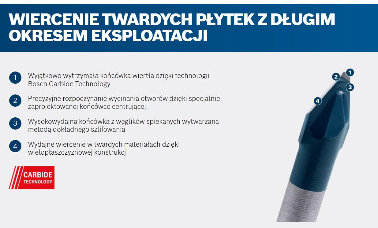 - Wyjątkowo wytrzymała końcówka wiertła dzięki technologii Bosch Carbide Technology