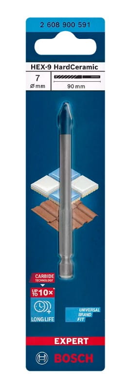 Wiertło Bosch EXPERT HEX-9 Hard Ceramic jest przeznaczone do wiercenia w ceramice i może wiercić otwory w twardych płytkach bez nawilżania i chłodzenia.