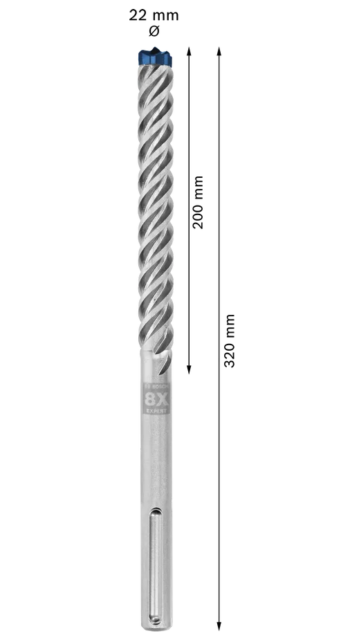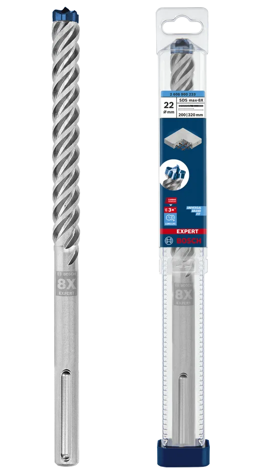 Wiertło udarowe Bosch EXPERT SDS max-8X umożliwia specjalistom z branży budowlanej regularne wiercenie w betonie i betonie zbrojonym, np. w przypadku kotew o dużej wytrzymałości lub przedłużeń prętów zbrojeniowych, zapewniając niezrównaną wydajność, niezawodność i trwałość. To jest osprzęt EXPERT do młotów udarowo-obrotowych SDS max.