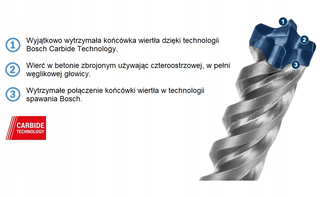 - Wyjątkowo wytrzymała końcówka wiertła dzięki technologii Bosch Carbide Technology.