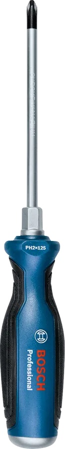 Wytrzymały wkrętak Bosch z metalowym grotem przechodzącym przez rękojeść oraz metalową nasadką udarową zapewnia szybkie wkręcanie, odkręcanie i podbijanie;