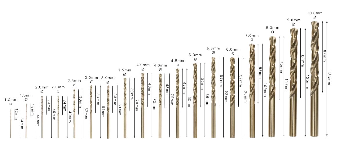 - 1,5 mm /2 mm /2 mm / 2,5 mm / 3 mm / 3 mm / 3,5 mm / 4 mm / 4 mm / 4,5 mm / 5 mm / 5,5 mm / 6 mm / 7 mm / 8 mm / 9 mm / 10 mm