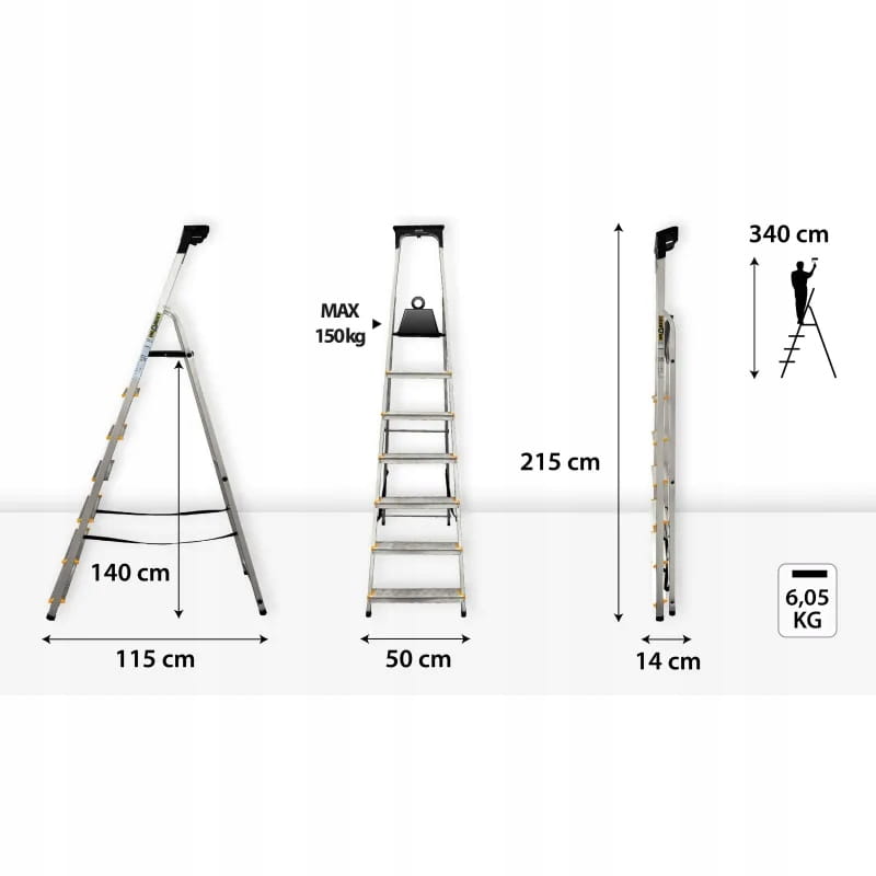 Dzięki imponującej konstrukcji, wysokość robocza drabiny jest idealnie dopasowana do potrzeb użytkowników o średnim wzroście 170 cm.