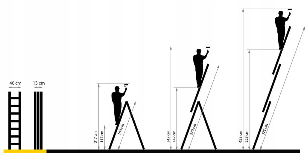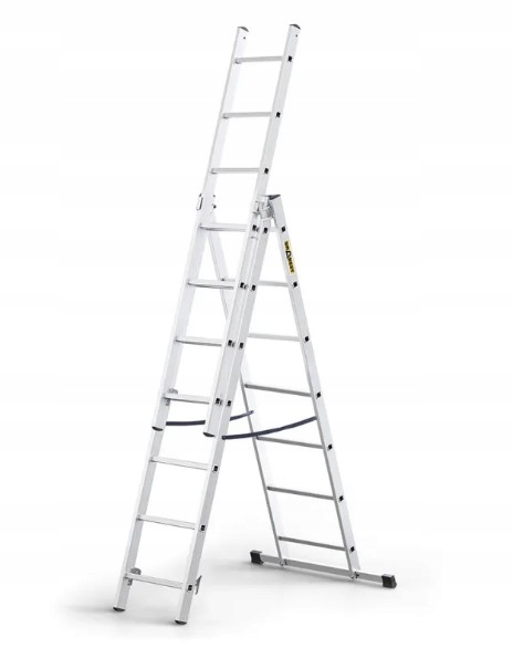 - Możliwość rozłożenia drabiny w pozycji przystawnej, wolnostojącej i z wysuniętym trzecim elementem