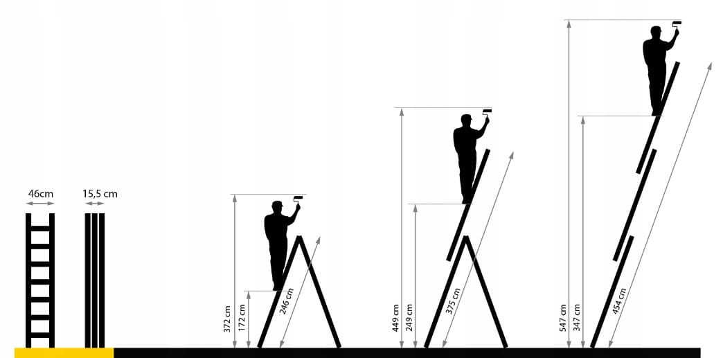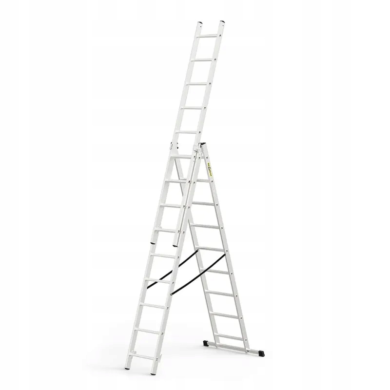 - Możliwość rozłożenia drabiny w pozycji przystawnej, wolnostojącej i z wysuniętym trzecim elementem
