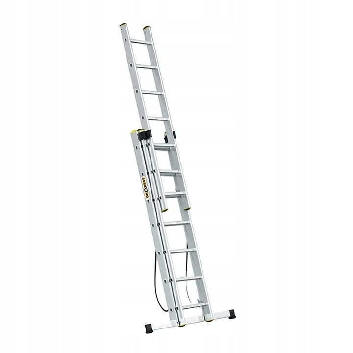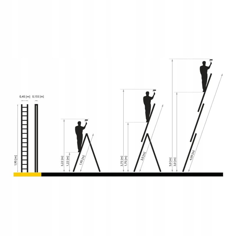 - Możliwość rozłożenia drabiny w pozycji przystawnej, wolnostojącej i z wysuniętym trzecim elementem