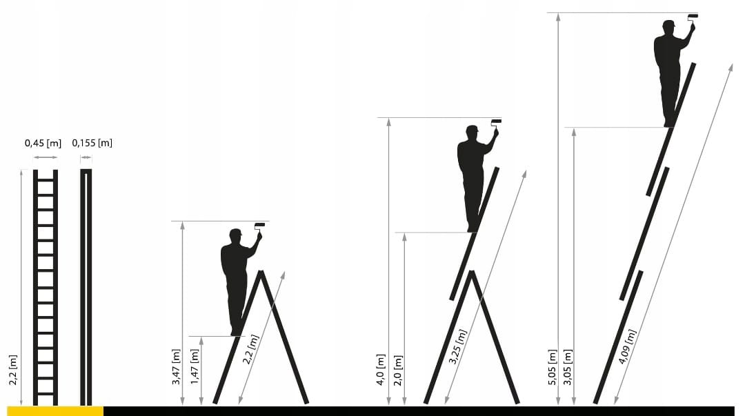 - Możliwość rozłożenia drabiny w pozycji przystawnej, wolnostojącej i z wysuniętym trzecim elementem