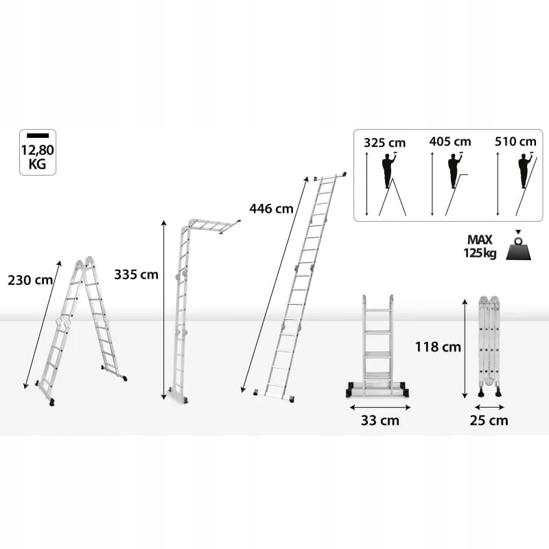 - Możliwość rozłożenia drabiny aż w 3 konfiguracjach