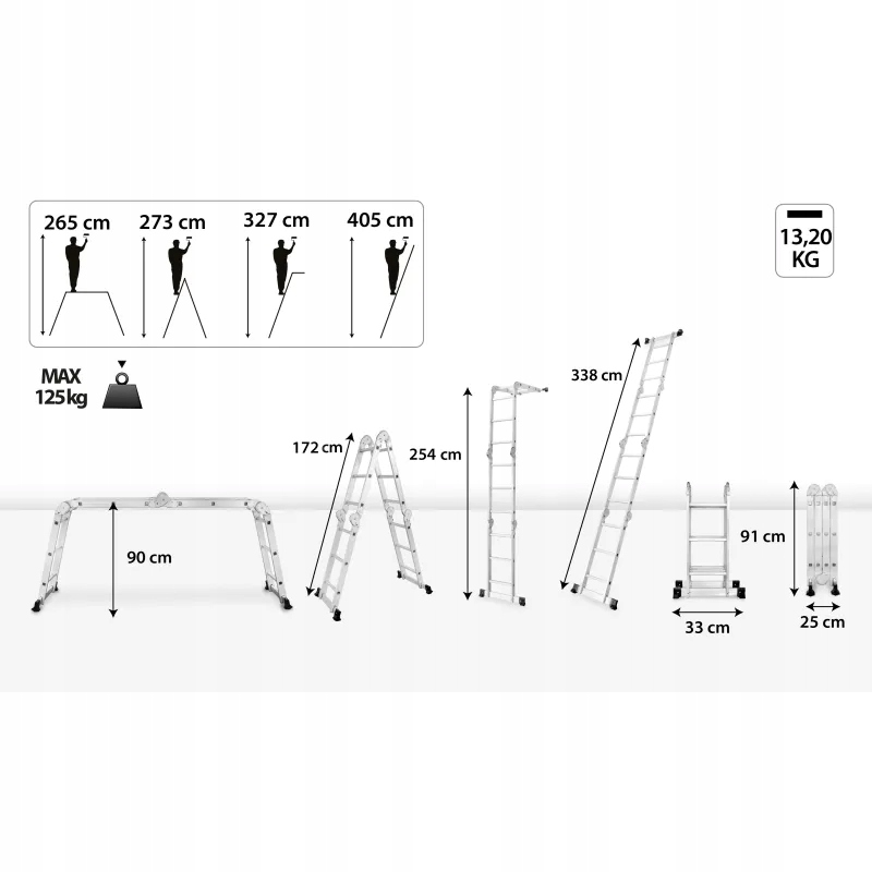 Wysokość drabiny wynosi od 2,65m do 4,05m.