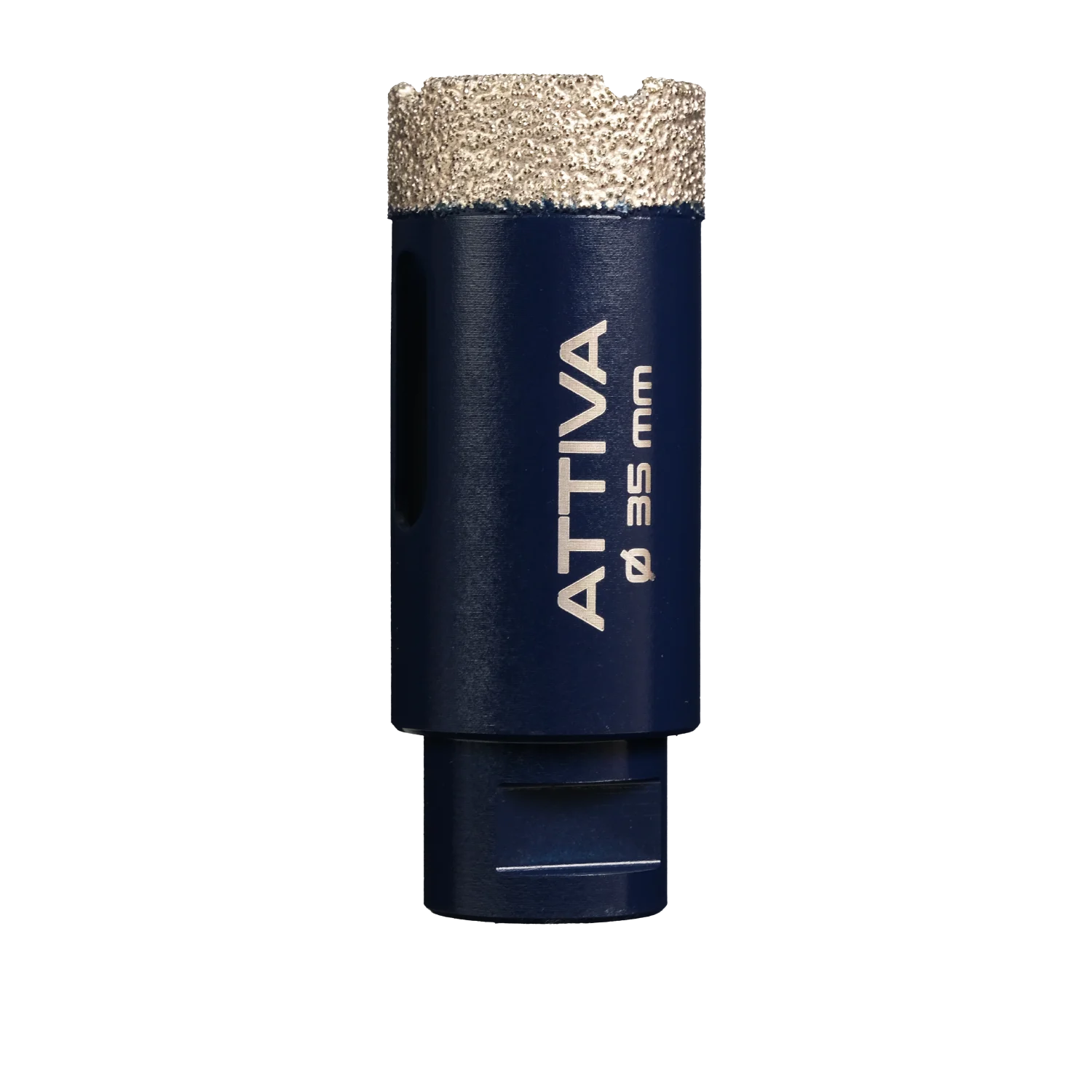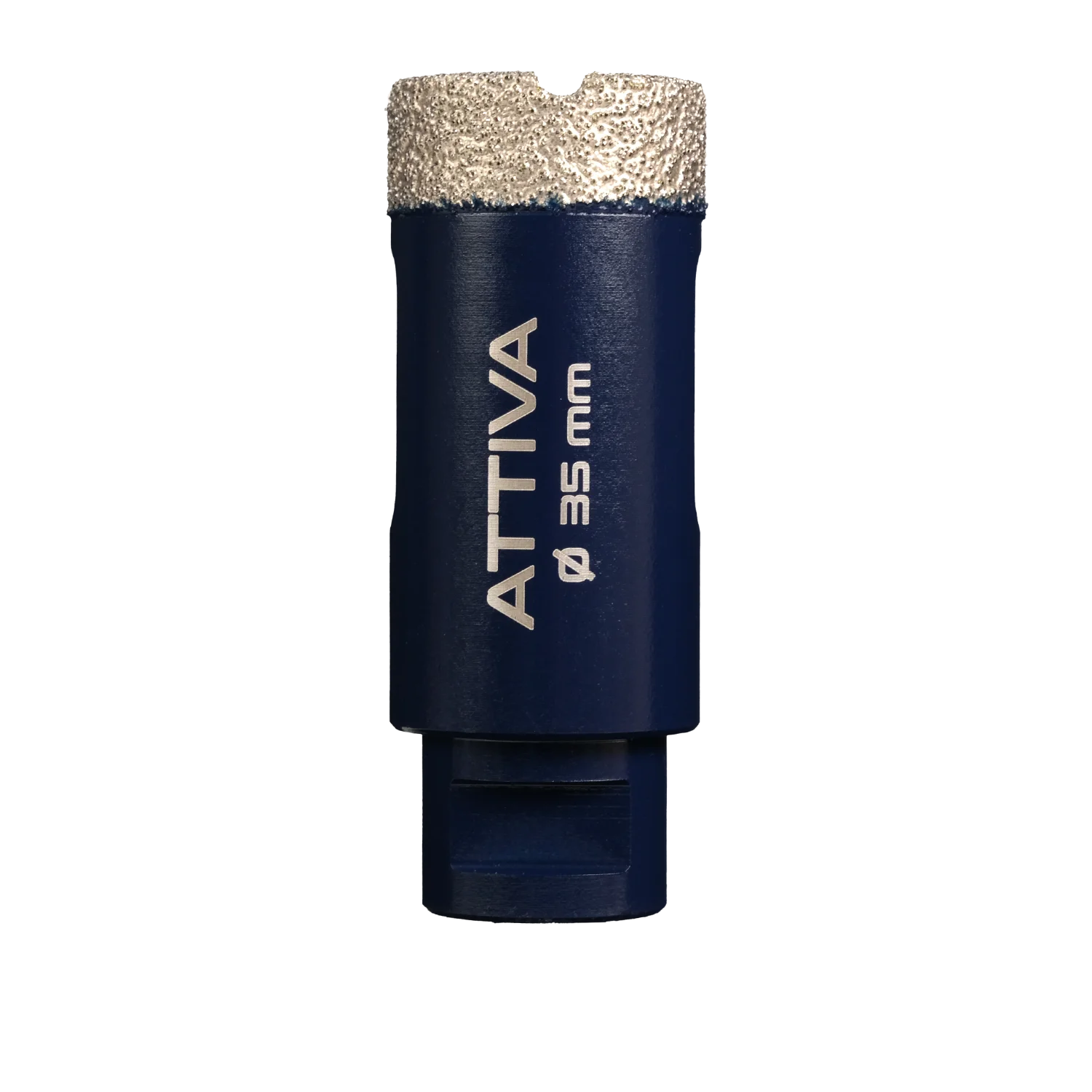 Grube okładziny potrafią być problematyczne dla standardowej budowy wierteł diamentowych, dlatego zaprojektowaliśmy wersję przedłużoną serii ATTIVA. Pomimo wyraźnie wyższej korony wiertła użytkowanie jest niezmiennie poręczne. Dodatkowy zasięg rozszerza możliwości robocze i umożliwia przewiercenie okładziny o grubości do 60mm.