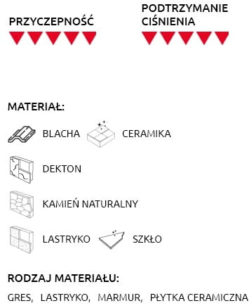 - Materiał: blacha, ceramika, dekton, kamień naturalny, lastryko, szkło