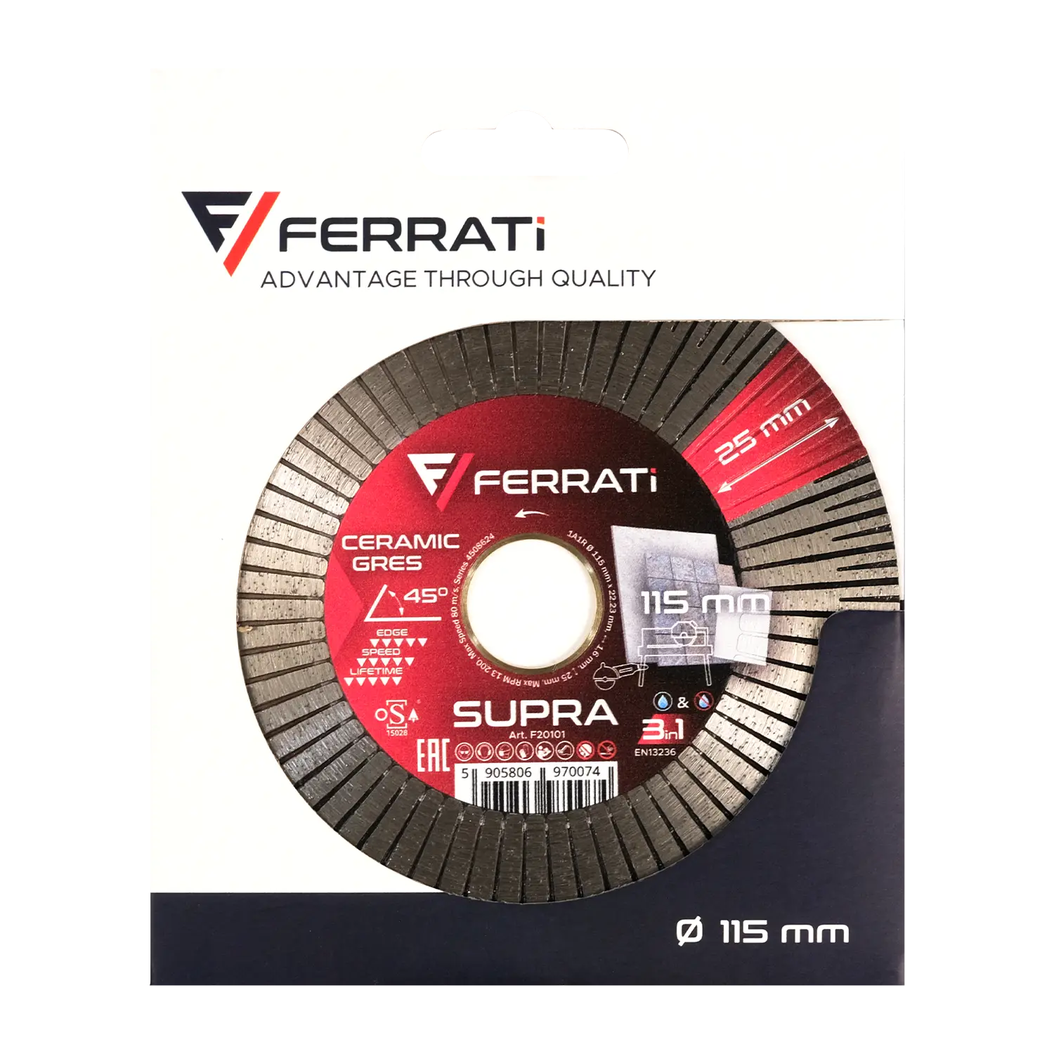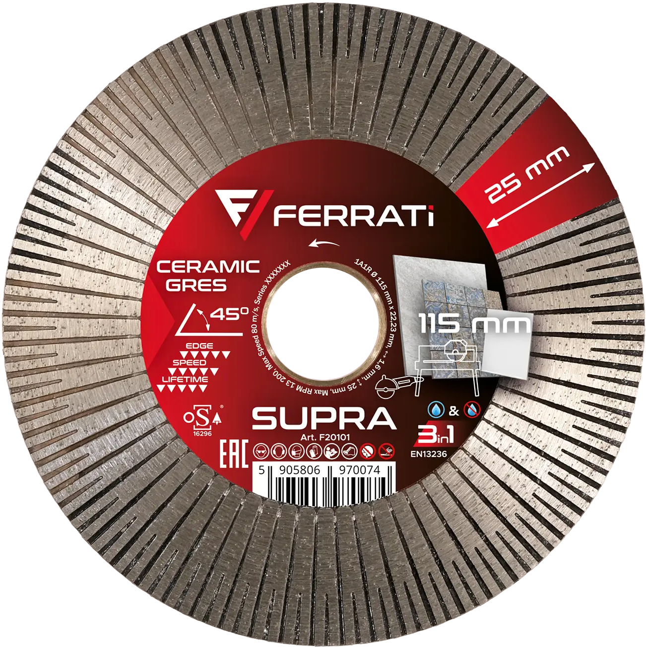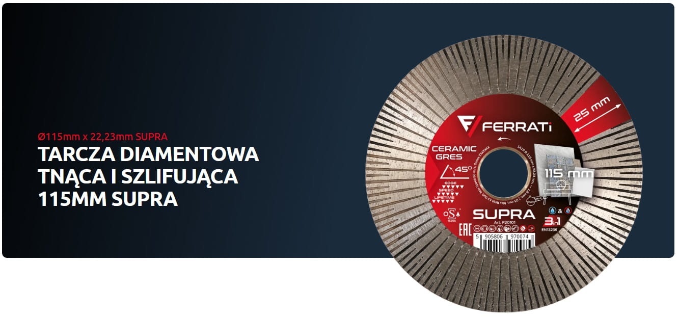 FERRATi TARCZA DIAMENT TNĄCA SZLIFUJĄCA 115 MM SUPRA 22,23 CERAMICA KAMIEŃ F20101