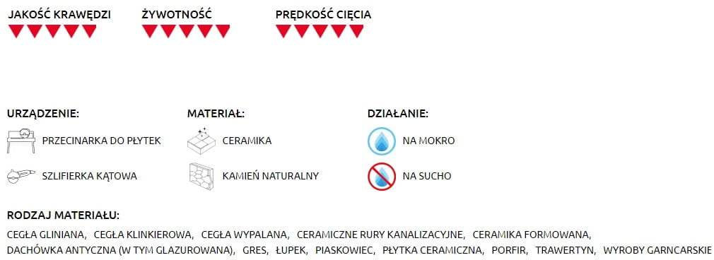 - Bardzo duże zagęszczenie oraz regularny diament powoduje idealną linie cięcia obrabianego materiału.