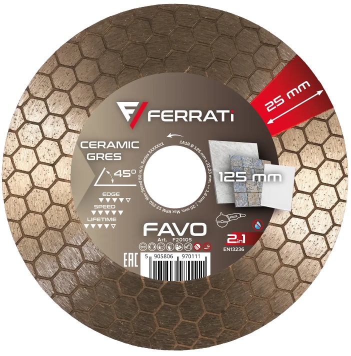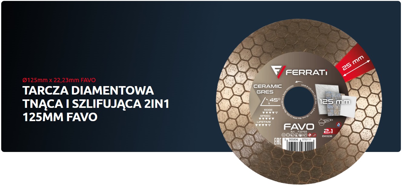 Tarcza FAVO oferuje wysoką efektywność dzięki zastosowaniu dwustronnego segmentu diamentowego w kształcie usystematyzowanych pól heksagonalnych tzw. plaster miodu. Warstwa sięgająca aż 25mm doskonale sprawdzi się przy cięciach profilujących krawędzie płytek ceramicznych i gresowych wszystkich typów. Jednocześnie umożliwia wykończenia krawędzi dzięki możliwości szlifowania boczną strona tarczy. Wysoka sprawność FAVO w połączeniu z dużą wytrzymałością na ścieranie pozwalają na jej długą i komfortową eksploatację.