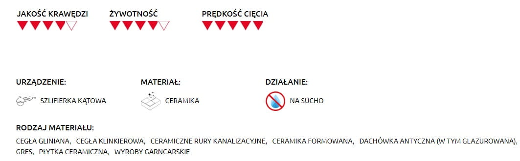 - Pełna masa diamentowa oraz regularny diament przekładają się na precyzyjną linię cięcia pod kątem 45°.
