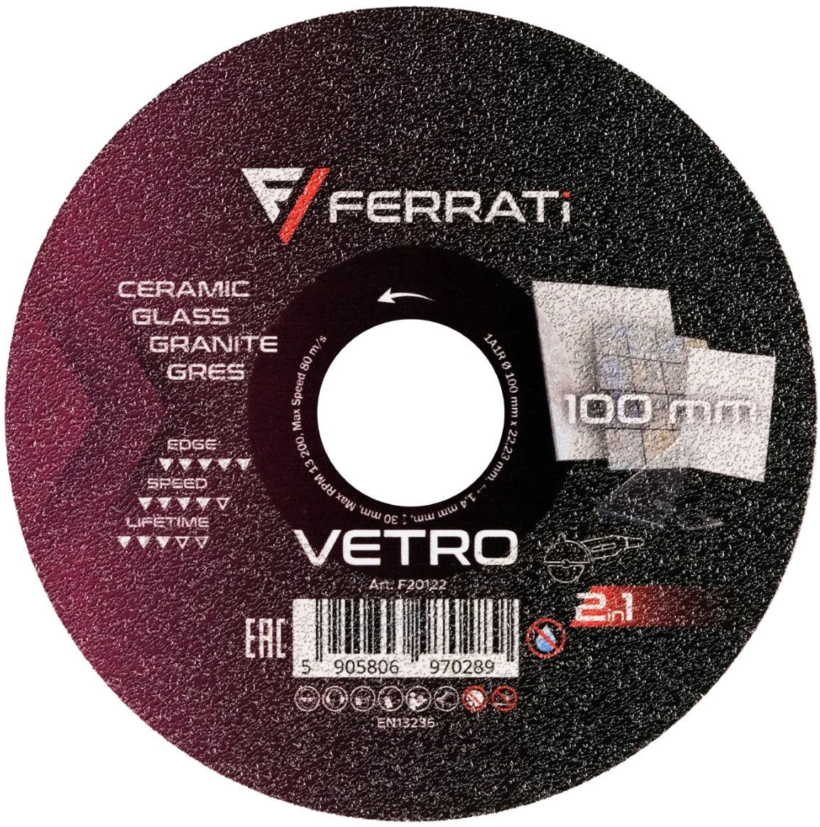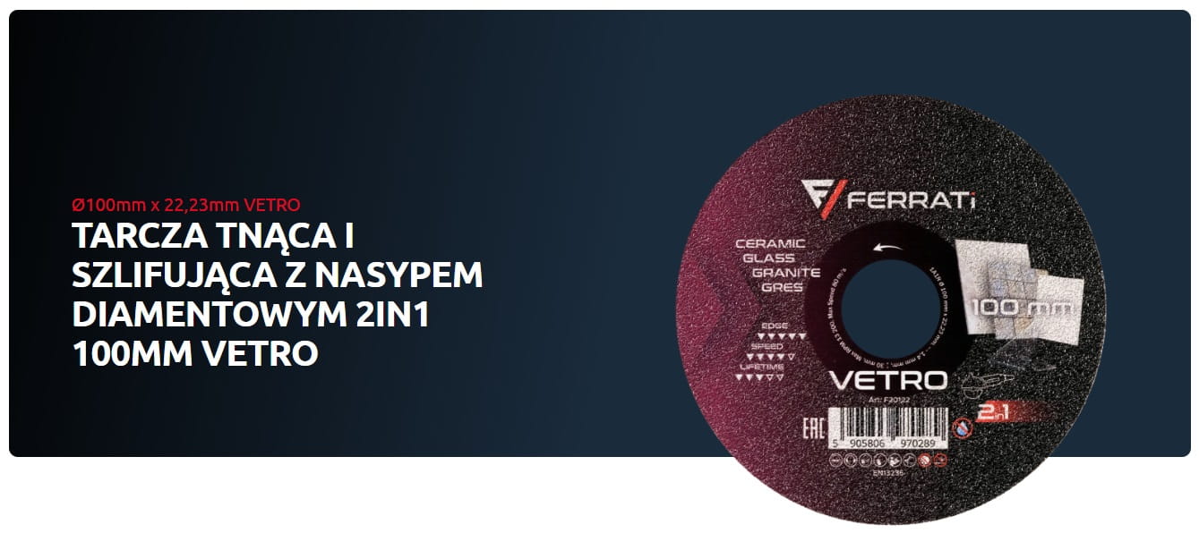 FERRATi TARCZA TNĄCA SZLIFUJĄCA DIAMENT 100 MM VETRO 22,23 CERAMIKA SZKŁO F20122