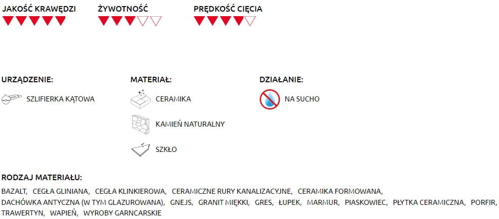 - Przeznaczona do cięcia i szlifowania szerokiej gamy materiałów np. ceramika, szkło, kamień naturalny.