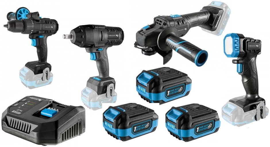 HOGERT ZESTAW WIERTARKA KLUCZ SZLIFIERKA LATARKA 18V AKUMULATOR 3 x 4 Ah