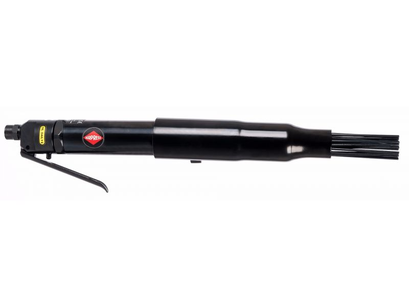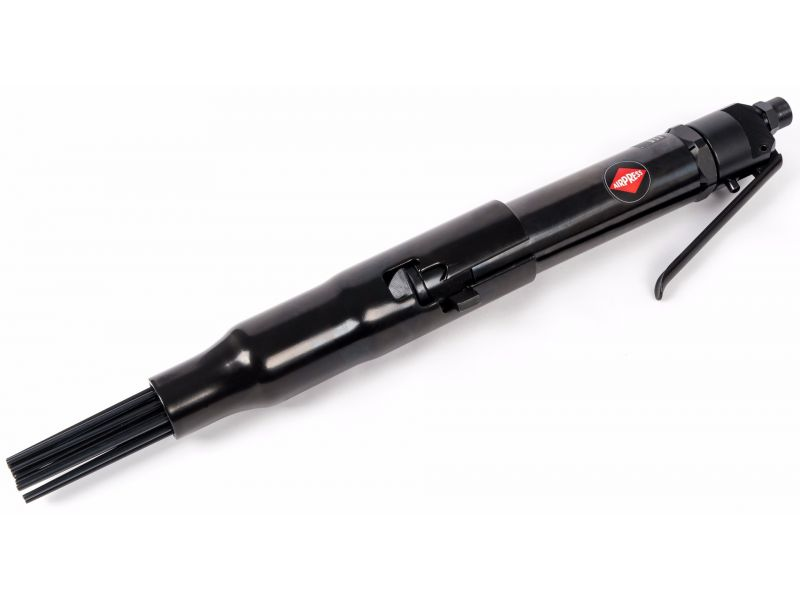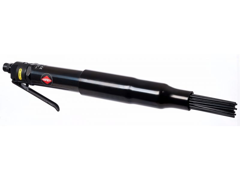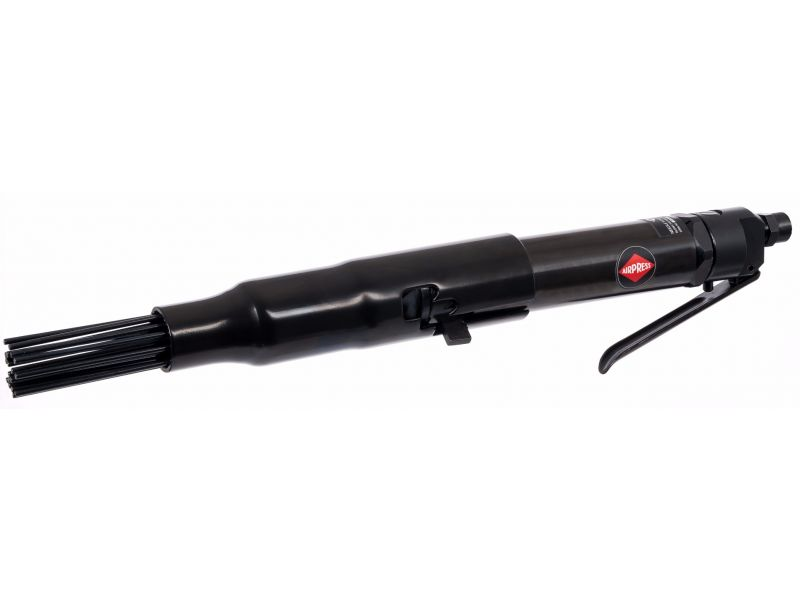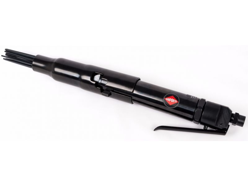Młotek igłowy 45488 Airpress to skuteczne urządzenie do oczyszczania stali z rdzy i innych naleciałości twardych. 19 igieł poruszających się z częstotliwością 4600 skoków na minutę pozwalają uzyskać efekt śrutowania – usuwając nawet trudną rdzę. Trzy pozycyjna regulacja skoków igieł ułatwia dostosowanie mocy do różnych elementów. Smukła sylwetka urządzenia pozwala na pracę w trudno dostępnych miejscach jak zagłębienia ram aut i urządzeń, wnętrza zbiorników itp. . Młotek igłowy 45488 uznanie znalazł w zakładach blacharskich (także aut ciężarowych), urządzeń rolniczych, remontowych i usługowych przy renowacji elementów stalowych.