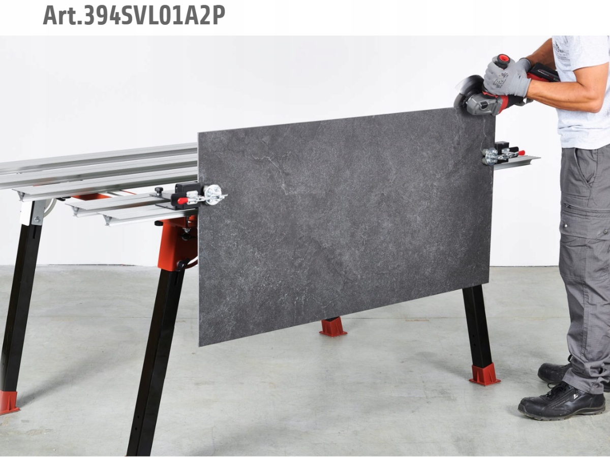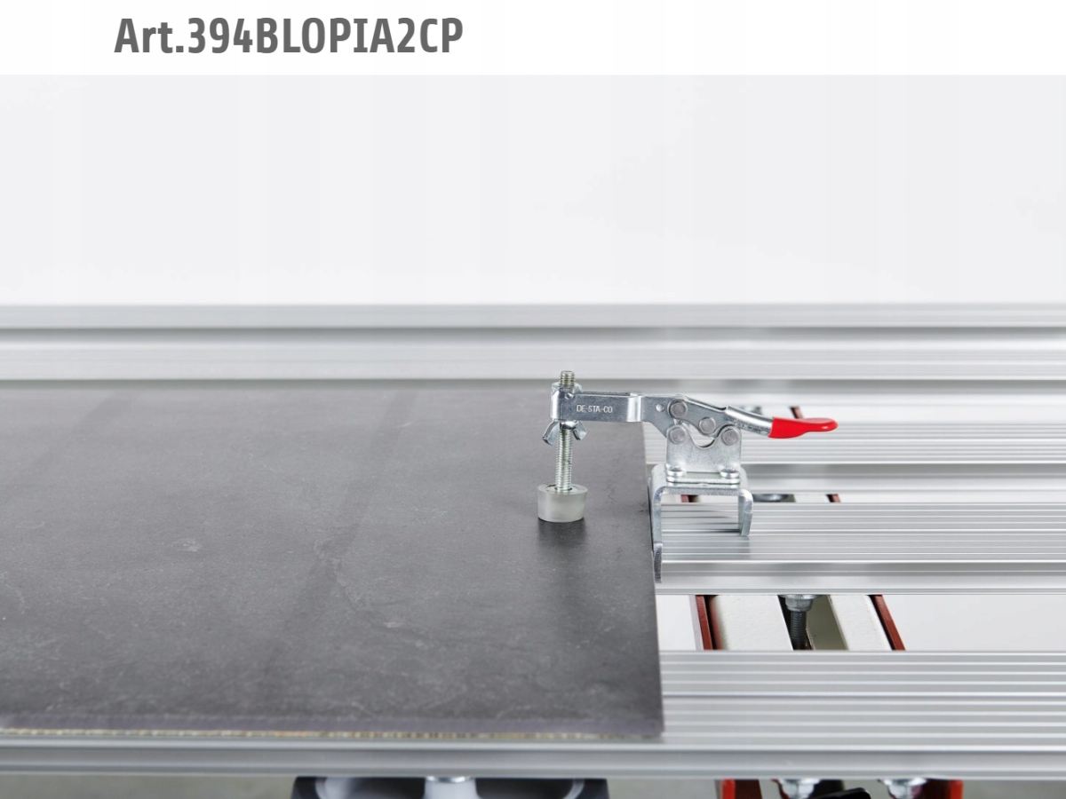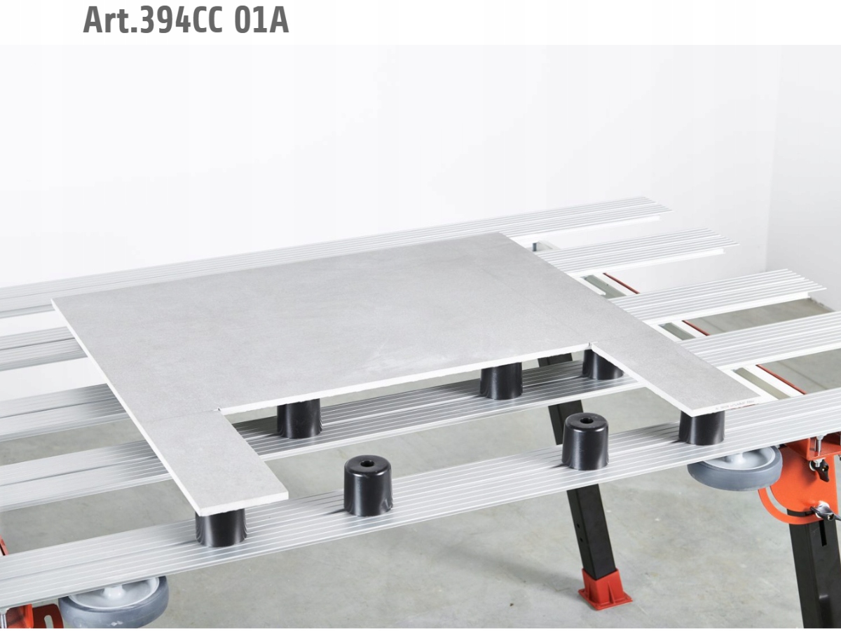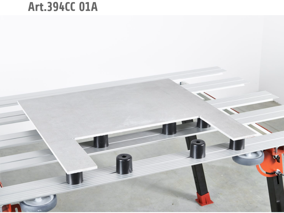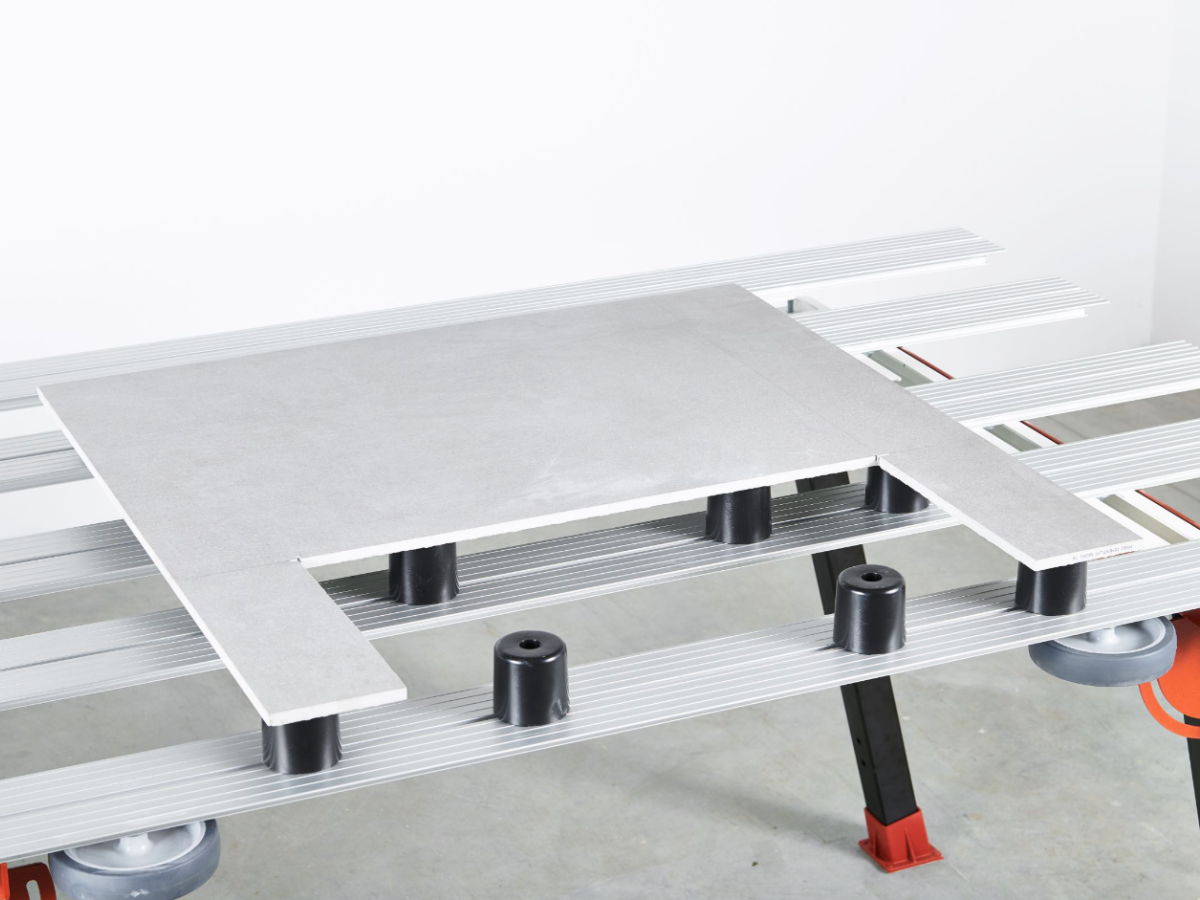 • Przesunięte i ruchome profile aluminiowe umożliwiają cięcie szlifierką kątową z tarczą diamentową bez uszkadzania powierzchni roboczej. Dodatkowo, specjalne rolki podporowe do płytek, dostępne jako akcesoria, tworzą szczelinę między płytką a powierzchnią roboczą i zapobiegają uszkodzeniu powierzchni roboczej przez tarczę diamentową, niezależnie od kierunku cięcia.