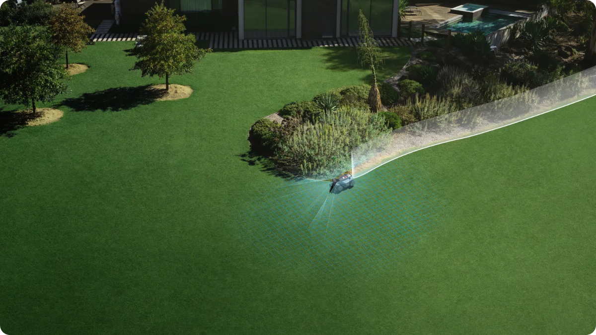 System 360° VisionFence™ z systemem kamer 3x niezawodnie wykrywa ponad 200 różnych przeszkód dzięki rozpoznawaniu obiektów wspieranemu przez AI. System jest uzupełniony precyzyjnym czujnikiem ToF, który precyzyjnie mierzy odległości i wykrywa przeszkody nawet w trudnych warunkach oświetleniowych lub złożonych kształtach. Robotyczna kosiarka analizuje sytuację w czasie rzeczywistym, dynamicznie dostosowuje trasę i zapewnia bezpieczną, nieprzerwaną pracę.