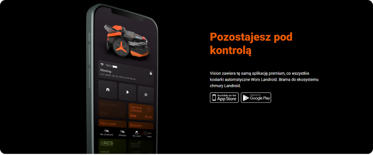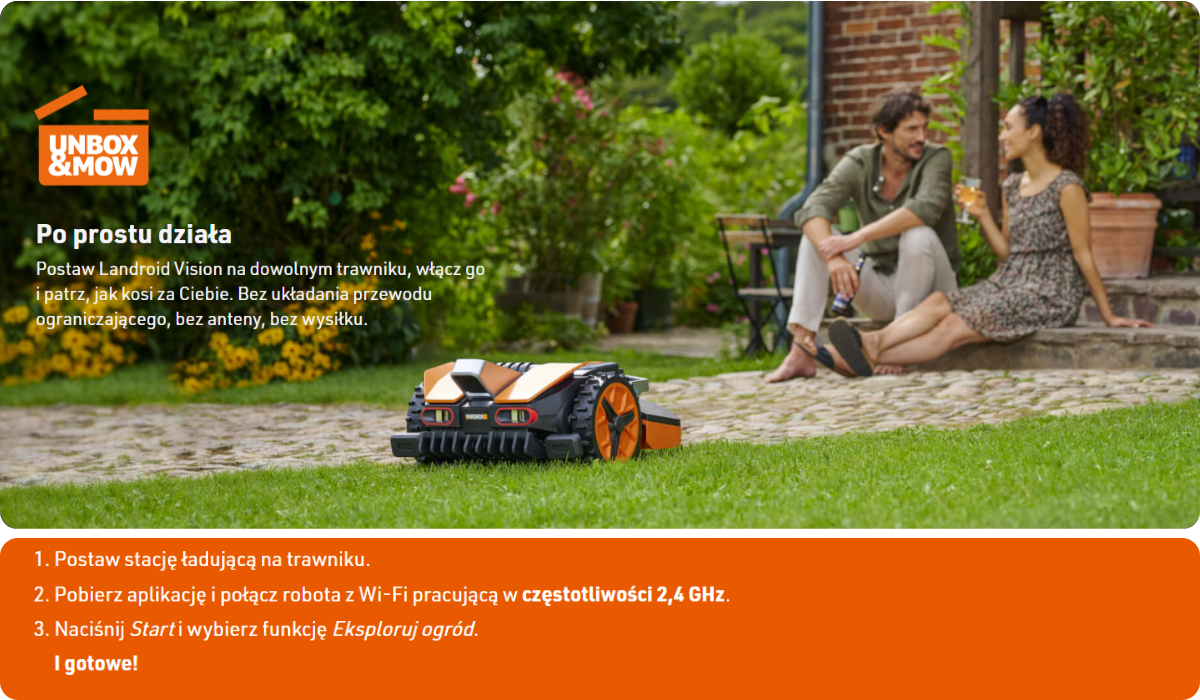 - Bez instalacji. Postaw Landroid Vision na dowolnym trawniku, włącz go i patrz, jak kosi za Ciebie.