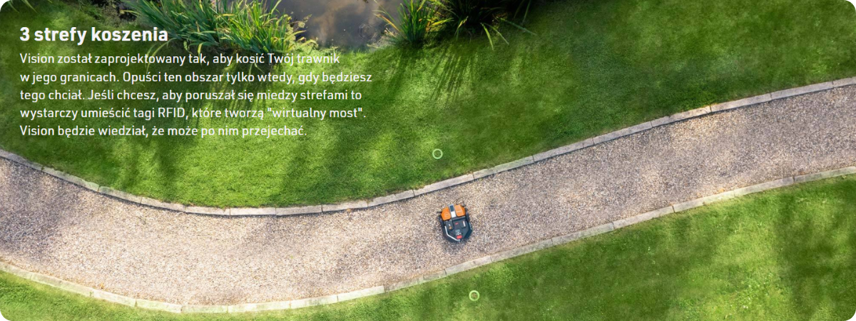 Do wyznaczenia dodatkowej strefy koszenia potrzebne są dwa dyski RFID. Oba dyski tworzą „wirtualny pomost” między strefami.