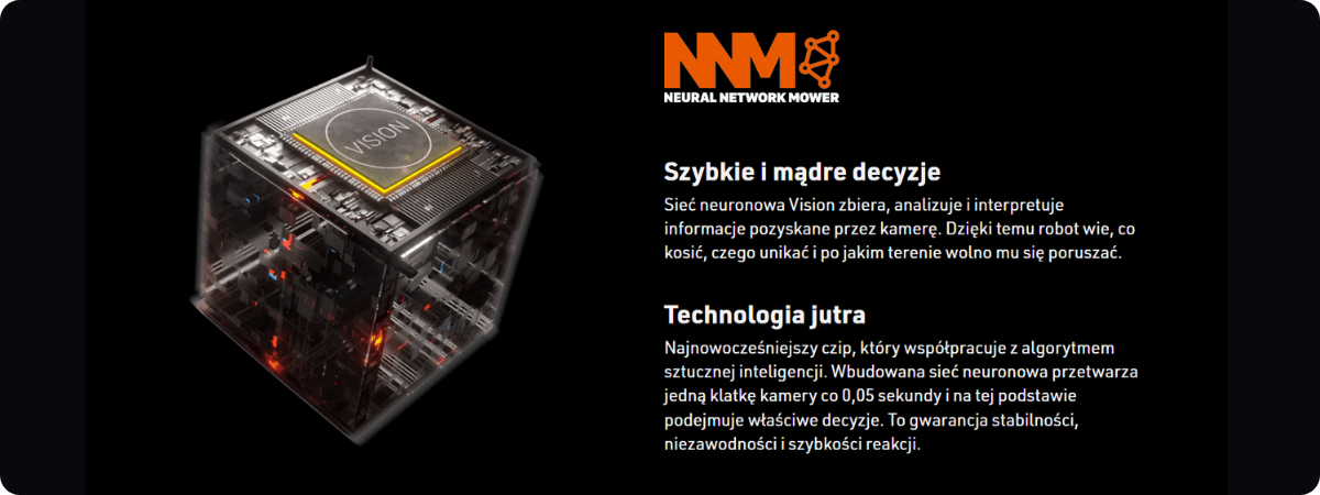 - Głęboka sieć neuronowa rozpoznaje trawę do skoszenia, przeszkody i granice, których nie należy przekraczać.