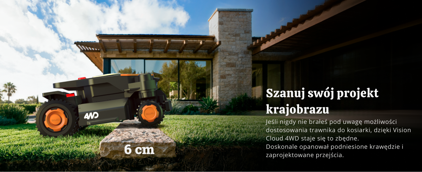 Jeśli nigdy nie chciałeś przystosować ogrodu do kosiarki, Vision Cloud 4WD eliminuje tę potrzebę. Bez wysiłku porusza się po podniesionych krawędziach i zaprojektowanych chodnikach. Twój ogród pozostaje twój.