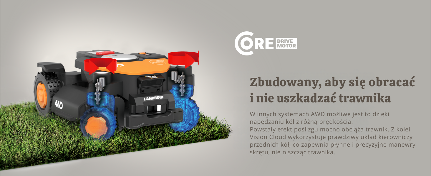Napęd 4WD może skręcać, uruchamiając koła z różną prędkością, co zużywa trawę. Vision Cloud wykorzystuje prawdziwe kierownictwo na przednim kole, zapewniając płynne i precyzyjne zakręty, które pozostawiają trawnik nietknięty.