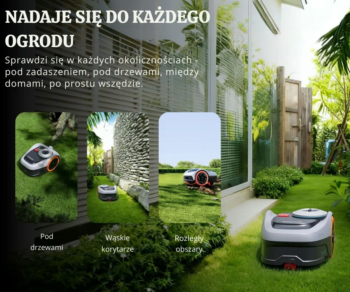 Nawet pod drzewami, na ścianach domów czy w wąskich przejściach, robotyczna kosiarka pozostaje dokładnie na kursie i nigdy nie omija trawnika.