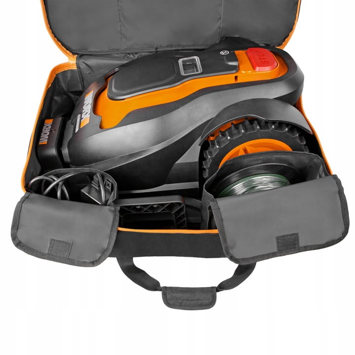Torba jest wykonana z wytrzymałego nylonu i posiada wiele wewnętrznych i zewnętrznych kieszeni. Idealnie nadaje się do bezpiecznego przechowywania i zimowania robotów koszących WORX. Podwójny uchwyt ułatwia przenoszenie.