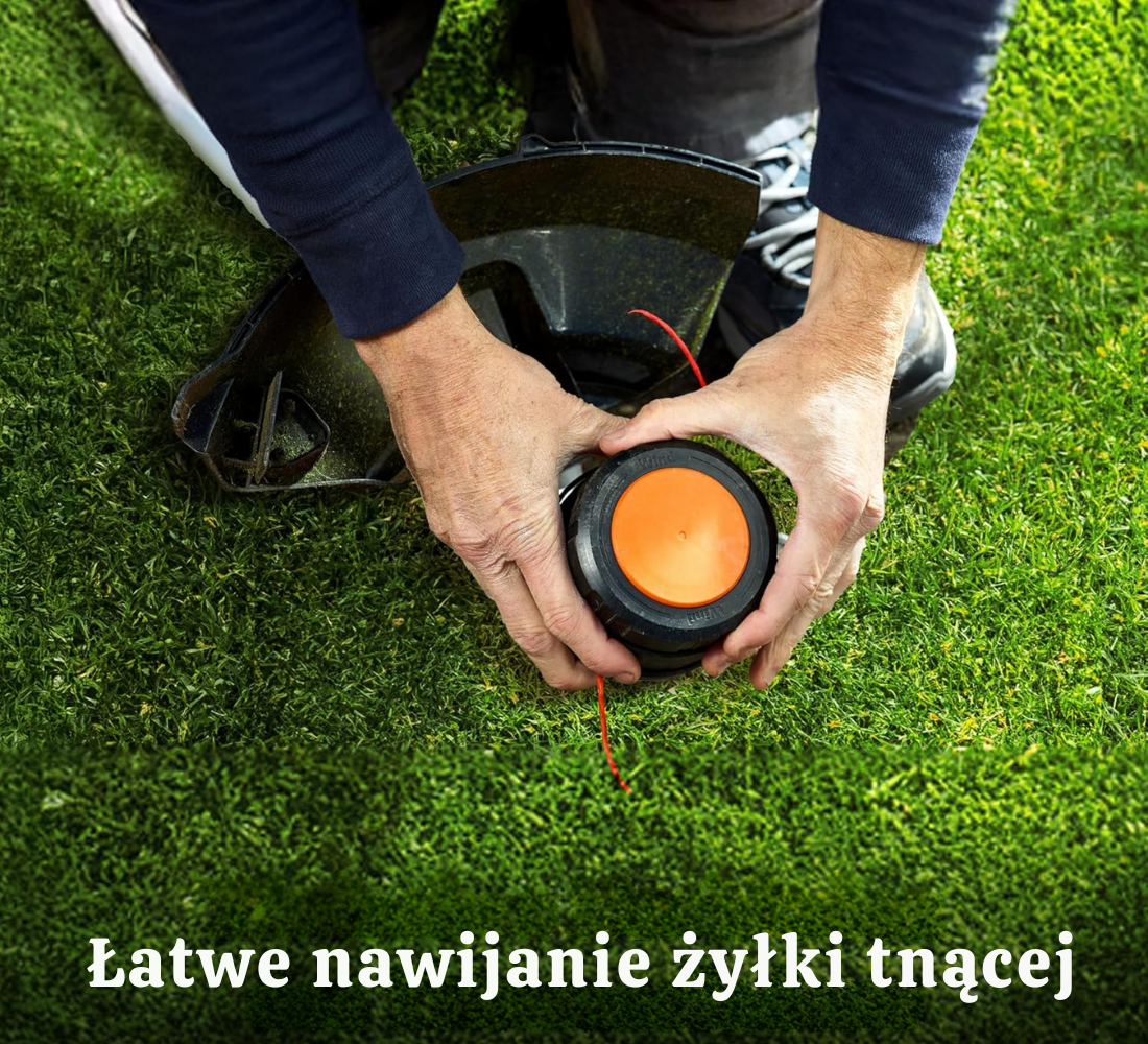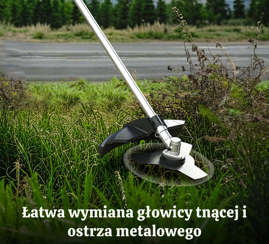 - Łatwa wymiana głowicy tnącej, elastyczny wybór między żyłką a ostrzem metalowym.