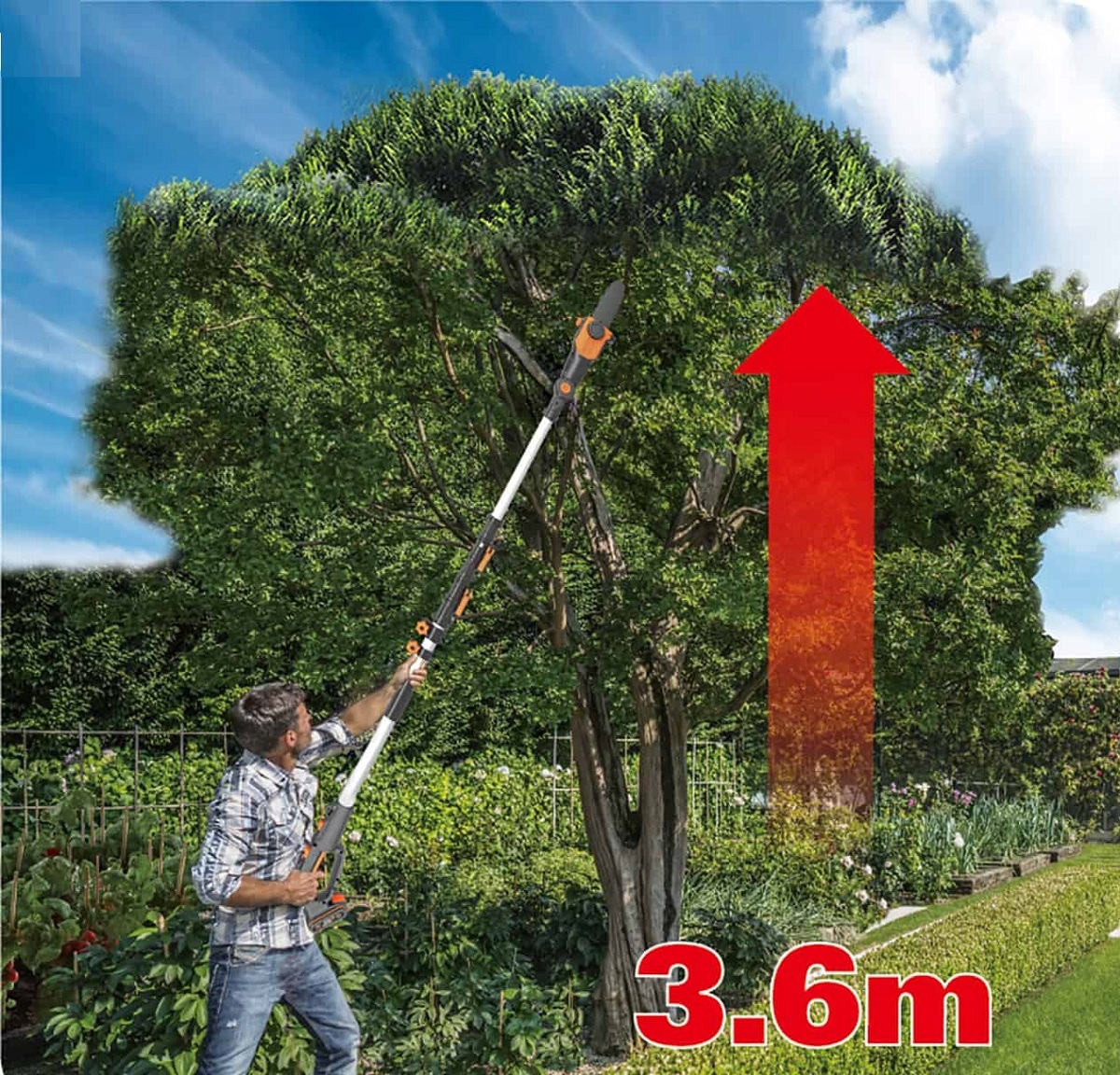 - Teleskopowy wysięgnik umożliwia sięgnięcie wyższych gałęzi – do 3,6 m